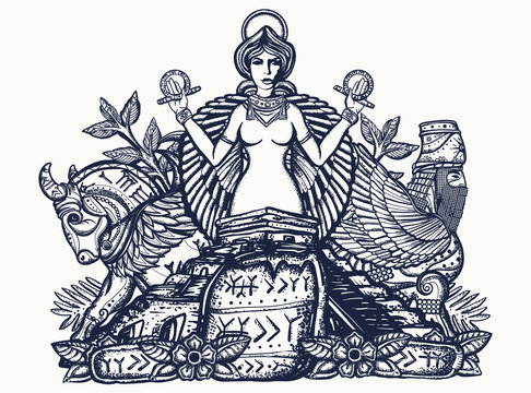 Ancient Sumerian Civilization Tattoo And T Shirt Design Mesopotamian Goddess Ishtar And Ziggurat Cuneiform Writing Assyrian Culture Gilgamesh Legends Middle East History Stock Vector Adobe Stock
